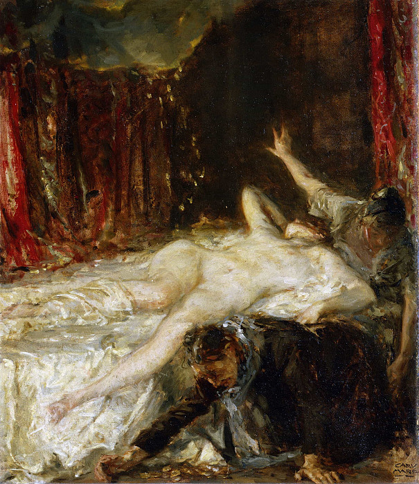 Справа от лежащей женщины возвышается фигура старца или демонического существа. Его облик внушает страх: глубоко посаженные глаза, заострённые черты лица, седые волосы и борода создают образ древней, могущественной силы. Он склонен над женщиной, его руки словно тянутся к ней, но при этом он сохраняет дистанцию, будто наблюдая за происходящим.
