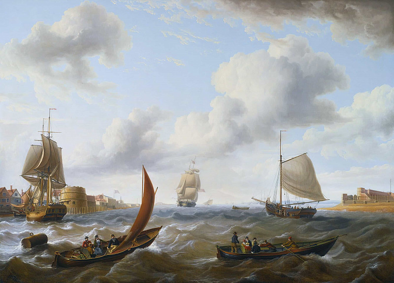 На этой картине автор изобразил оживлённую морскую сцену, где доминируют военные корабли и небольшие суда, входящие в гавань. Вдали видны городские постройки, что указывает на значимость порта как стратегического и экономического центра. Небо заполнено динамичными облаками, создающими ощущение надвигающейся непогоды. Море изображено бурным, с заметной рябью и волнами, что подчёркивает неспокойную атмосферу и сложность морского пути. Волнение воды отражается в движении парусов и лодок, придавая композиции ощущение динамизма и напряжения. В переднем плане мы видим несколько небольших лодок с людьми на борту, которые, судя по их позам и жестам, пытаются справиться с волнением. Их присутствие создаёт контраст между мощью военных кораблей и уязвимостью обычных людей, сталкивающихся с силой природы. Корабли занимают центральное место в композиции. Они изображены в разных ракурсах, что позволяет рассмотреть их детали: паруса, мачты, флаги. Их внушительные размеры и мощь подчёркивают военную силу государства, контролирующего гавань. Цветовая палитра картины выдержана в приглушённых тонах – преобладают серые, синие и коричневые оттенки, что соответствует драматизму сцены и создаёт ощущение реализма. Свет играет важную роль: он акцентирует внимание на определённых деталях, подчёркивает объёмность объектов и усиливает эффект от бушующего моря. Подтекст картины можно интерпретировать как отражение мощи морской державы, ее влияния на экономику и стратегическое значение портов. Неспокойное море может символизировать трудности и опасности, с которыми сталкиваются люди в своей повседневной жизни, а также подчёркивает силу природы, которая способна противостоять даже самым могущественным силам. На мой взгляд, картина создаёт ощущение величия, напряжения и драматизма, характерных для морской эпохи.
