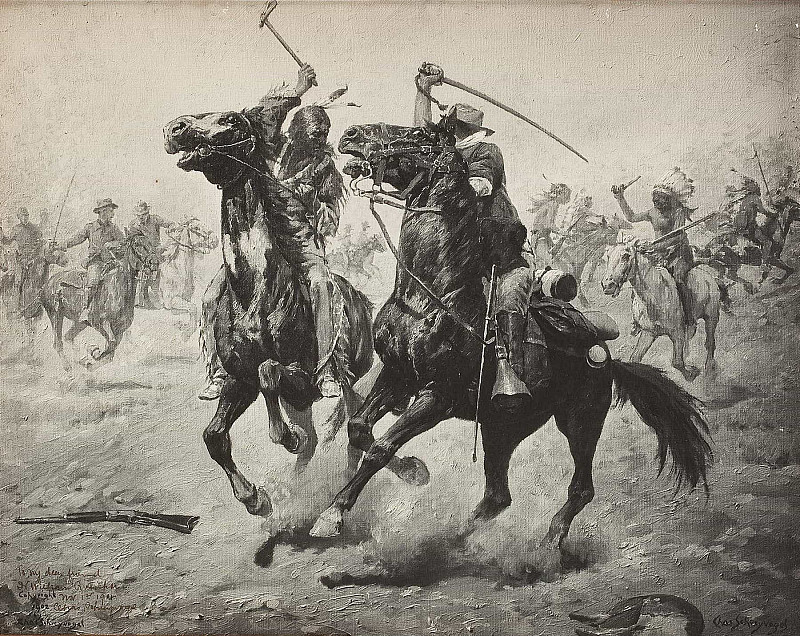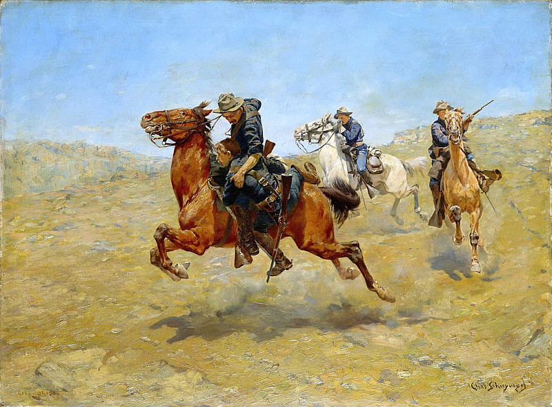 Всадники одеты в традиционную ковбойскую одежду: широкополые шляпы, рубашки, жилеты и штаны. Их позы и выражения лиц говорят о готовности к действию, возможно, преследованию или спасению кого-либо. Несмотря на кажущуюся простоту сюжета, картина затрагивает темы мужества, ответственности и жизни на границе цивилизации.