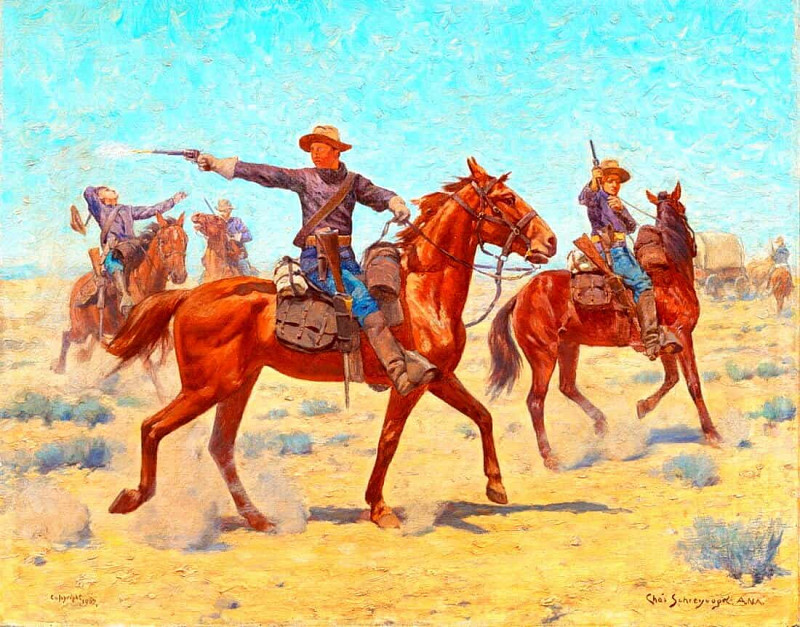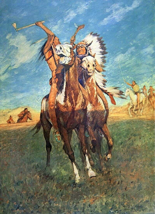 Всадники одеты в традиционную одежду, включающую головные уборы с перьями и кожаные набедренные повязки. Их тела обнажены, что подчёркивает их физическую силу и связь с природой. Лошади, на которых они восседают, также изображены в движении, демонстрируя мощь и грацию этих животных.