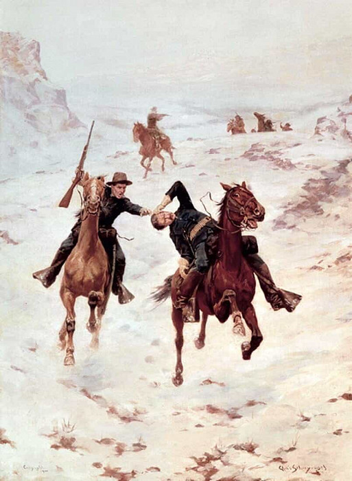 В картине можно усмотреть несколько подтекстов. Сцена, вероятно, отражает конфликт между цивилизацией и дикой природой, или же противостояние различных социальных групп. Падение человека в форме может символизировать потерю власти или крушение надежд. Всадник на коне, напротив, олицетворяет силу, независимость и выживание в сложных условиях. Общая атмосфера картины пронизана ощущением опасности, неопределённости и борьбы за существование. Она передаёт дух времени, характеризующийся конфликтами, приключениями и постоянной угрозой насилия.