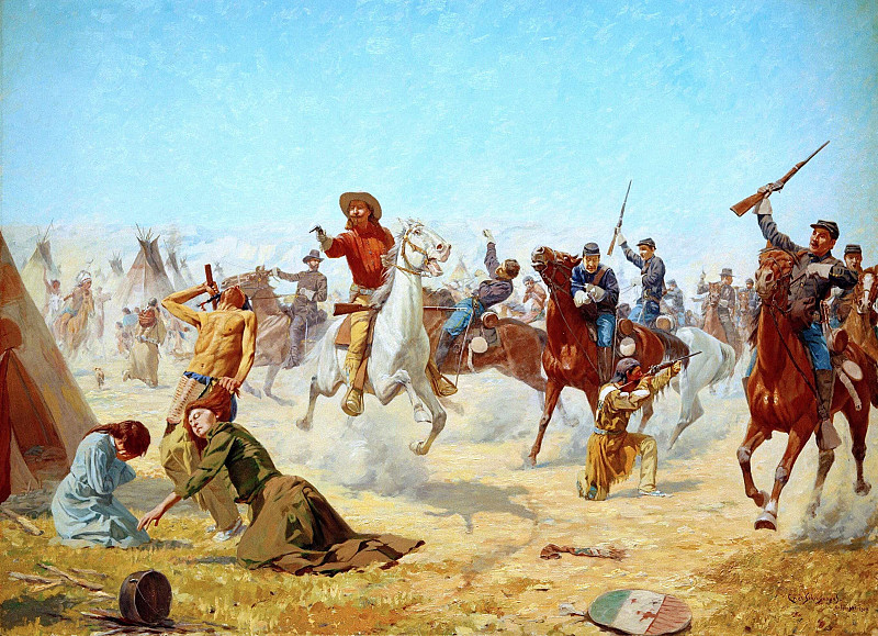 В подтексте картина может говорить о конфликте между двумя культурами, столкновении цивилизаций или борьбе за ресурсы. Фигура человека без рубашки, пытающегося защититься, символизирует уязвимость и отчаяние перед лицом превосходящей силы. Положение женщины, склонившейся над ним, может интерпретироваться как символ сострадания и надежды в условиях жестокости и насилия. Общий драматизм сцены вызывает вопросы о справедливости, морали и цене победы.