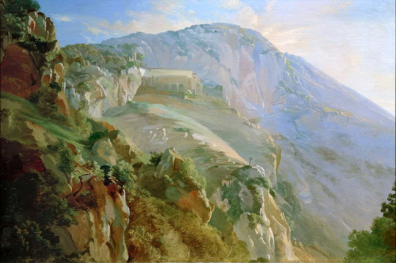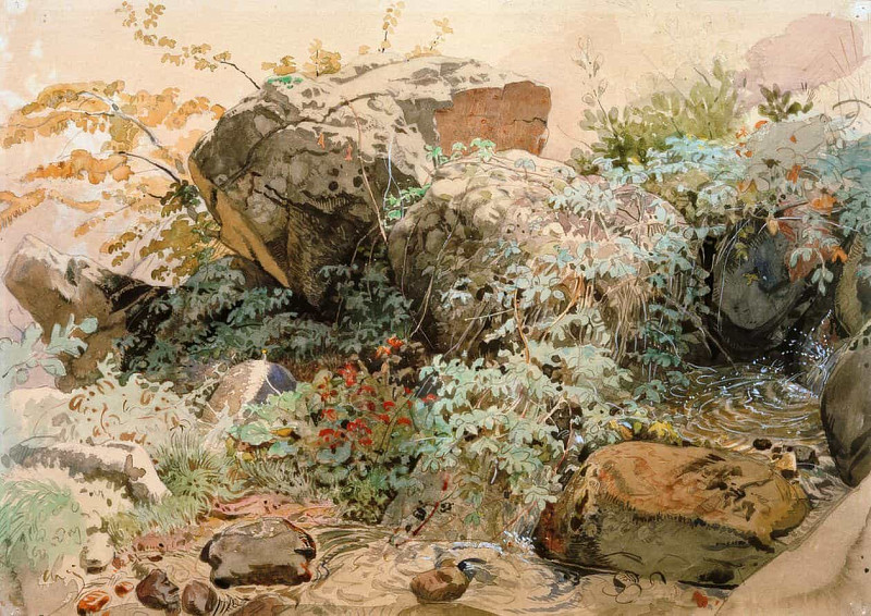 Фридрих Нерли – Каменные глыбы, заросшие кустарником, у горного ручья