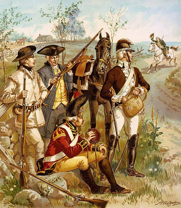 В центре внимания – мужчина в красном мундире с треугольной шляпой, сидящий на камне и держащий ружье. Его поза выражает усталость и некоторую задумчивость. Рядом с ним стоит человек в тёмном костюме и парике, его взгляд направлен вперёд, что может символизировать настороженность или готовность к действию. Слева от них – мужчина в белой меховой накидке, также держащий оружие. Его поза более расслабленная, но при этом сохраняется ощущение военной дисциплины.