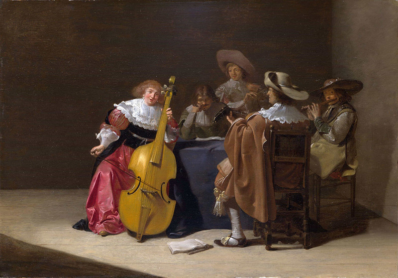 Свет, падающий из окна слева, создаёт контраст между освещёнными участками и глубокими тенями, придавая картине драматизма и подчёркивая объёмность фигур. На полу у ног музыканши лежит нотный лист, намекающий на подготовленность и профессионализм исполнения.