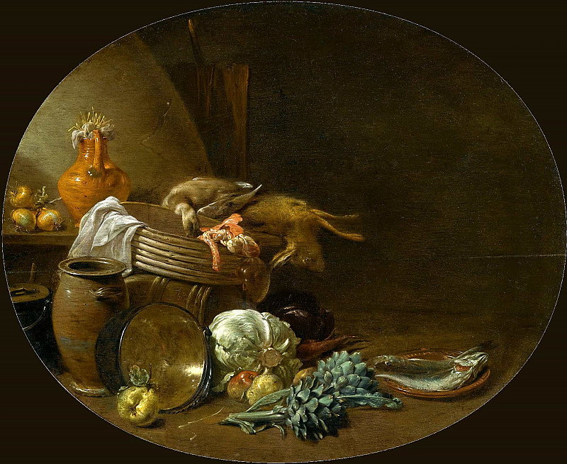 На картине мы видим натюрморт, выполненный в тёмной, сдержанной цветовой гамме. Композиция выстроена вокруг массивного деревянного стола, занимающего большую часть пространства. На столе аккуратно разложены предметы быта и продукты питания, создающие ощущение изобилия и домашнего уюта. В центре внимания – мёртвая дичь: заяц лежит на боку, рядом с ним примостилась утка. Их присутствие вносит элемент трагизма и напоминает о цикличности жизни и смерти. Рядом с ними расположены свежие овощи: артишоки, капуста, груши, а также рыба, поданная на глиняном блюде. Разнообразие текстур и форм продуктов создаёт визуальный интерес. На заднем плане видны кухонные принадлежности – горшок, сковорода, ваза с фруктами, сложенные ткани. Они добавляют сцене реалистичности и погружают зрителя в атмосферу домашней кухни. Освещение неравномерное: яркий свет падает на передний план, выделяя основные объекты, а задний план остаётся в полумраке, что создаёт эффект глубины и объёма. В картине прослеживается несколько подтекстов. Во-первых, это аллюзия на бренность бытия – сочетание свежих продуктов и мёртвой дичи напоминает о скоротечности жизни. Во-вторых, изображение может быть интерпретировано как символ достатка и благополучия, поскольку представлено обилие еды. Наконец, картина отражает уважение к труду и простым радостям домашнего быта. Манера исполнения отличается реалистичностью и вниманием к деталям. Художник мастерски передаёт фактуру различных материалов – шерсть животного, гладкую поверхность фруктов, грубую текстуру глиняной посуды. Картина вызывает ощущение спокойствия и созерцательности, приглашая зрителя задуматься о вечных вопросах жизни и смерти.