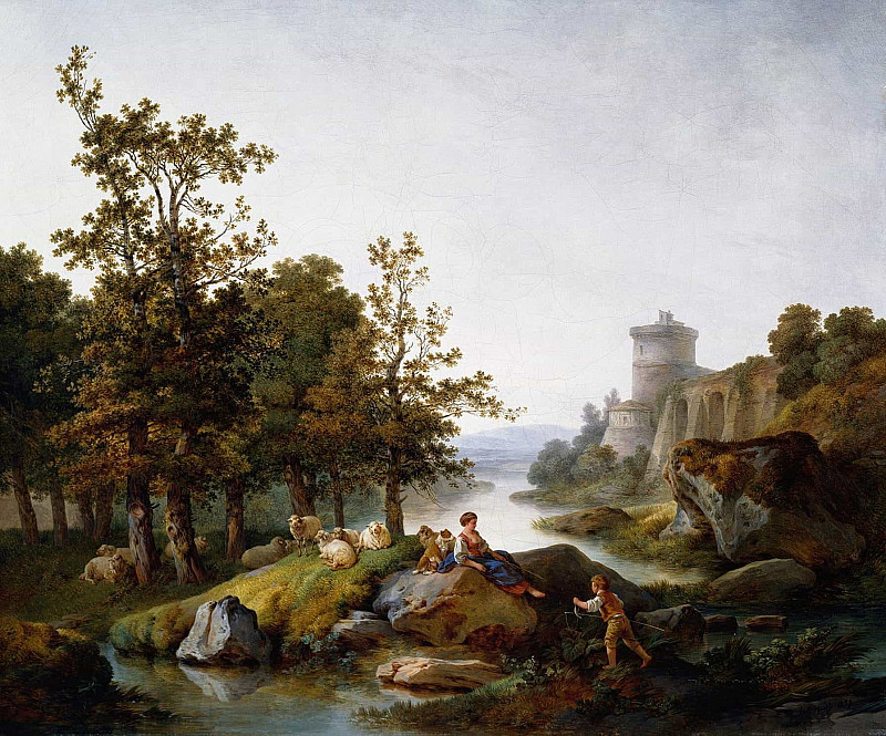 Жан-Батист Юэ – Пейзаж с пастушкой и мальчиком, ловящим рыбу