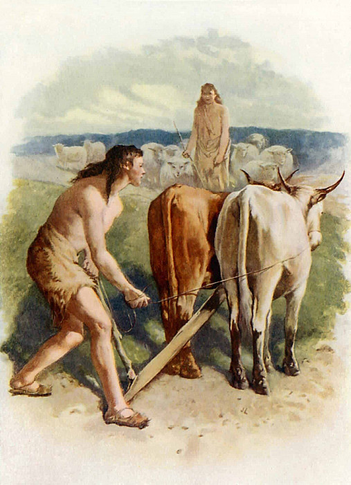 Второй персонаж, расположенный дальше от зрителя, стоит среди стада овец. Он одет в простую тунику, его поза более расслабленная, чем у человека с плугом. Взгляд этого мужчины направлен вдаль, словно он наблюдает за происходящим или размышляет о чем-то большем.
