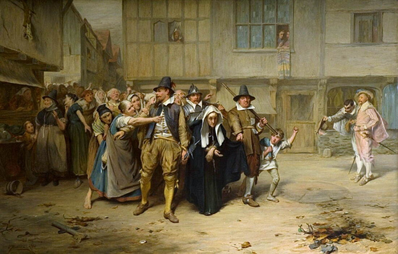Вокруг арестованной собралась толпа зевак – горожане разных возрастов и социальных слоёв. Их лица выражают любопытство, страх и даже злорадство. Некоторые женщины плачут, другие перешёптываются, а дети тянутся вперёд, чтобы лучше разглядеть происходящее. Эта разношёрстная толпа подчёркивает общественный характер обвинения и суровости наказания за колдовство.