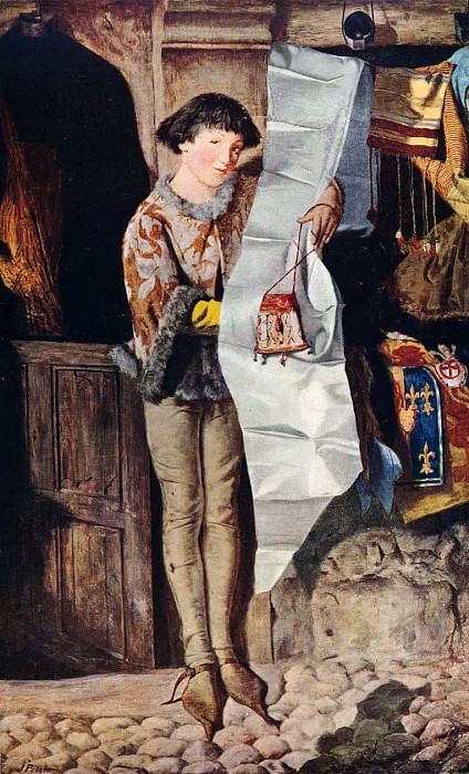 Внешний вид молодого человека указывает на его принадлежность к низшему сословию: одежда хоть и богато украшена, но выглядит изношенной, а обувь – простой и грубой. Его поза выражает задумчивость или даже некоторую печаль; взгляд направлен на предмет в руке, словно он размышляет о его значении.