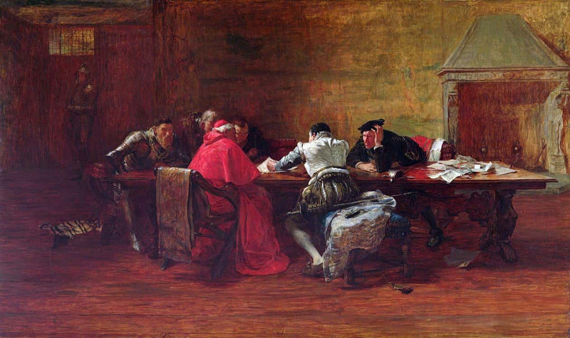 Мужчины одеты в костюмы, указывающие на их высокий социальный статус. Один из них выделяется своим алым одеянием, что может символизировать его значимость или власть. Другие фигуры выглядят более сдержанно, но все они демонстрируют напряжённость и сосредоточенность. На столе разбросаны документы, возможно, договоры или указы, вокруг которых происходит обсуждение.