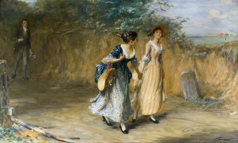 В картине можно усмотреть несколько подтекстов. С одной стороны, она отражает безмятежную жизнь провинциального общества, где царят спокойствие и гармония. С другой стороны, фигура мужчины на заднем плане может символизировать отстранённость и одиночество, контрастирующие с радостью и лёгкостью молодых женщин. Возможно, он представляет собой наблюдателя, который не может разделить их счастье или является представителем более консервативного мира.