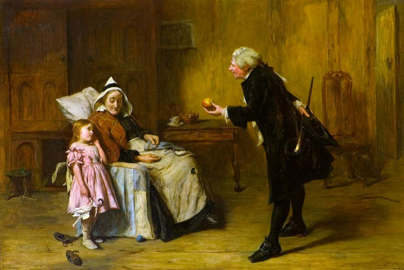В правой части изображения мы видим мужчину в медицинской мантии, который протягивает женщине какой-то предмет – возможно, лекарство или фрукт. Его поза и выражение лица выражают заботу и профессионализм. Он одет достаточно консервативно, что указывает на его статус и положение в обществе. Заметно, что он несёт сумку с медицинскими принадлежностями, что подтверждает его профессию.