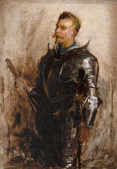 Художник использует приглушённую цветовую палитру, преобладают оттенки коричневого, серого и охры, что создаёт ощущение тяжести и суровости. Свет падает на доспехи и лицо мужчины, подчёркивая их фактуру и объем. Манера письма свободна и экспрессивна – заметны широкие мазки кистью, создающие эффект движения и некой незаконченности. Это указывает на то, что работа могла быть этюдом или подготовительным эскизом для более масштабного произведения.