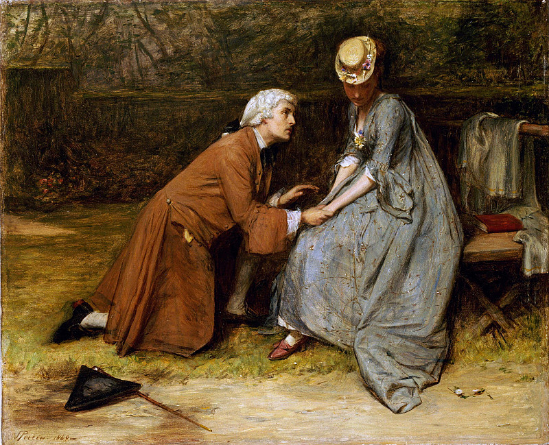 Смысловое наполнение картины многогранно. Поза мужчины на коленях указывает на его подчинённое положение и готовность к уступкам. Жест женщины, её отстранённость и избегание зрительного контакта, могут интерпретироваться как нерешительность или даже нежелание принять предложение. Вместе с тем, отсутствие открытой враждебности в жестах персонажей предполагает сложность ситуации, где присутствует напряжение, но нет однозначного отказа.