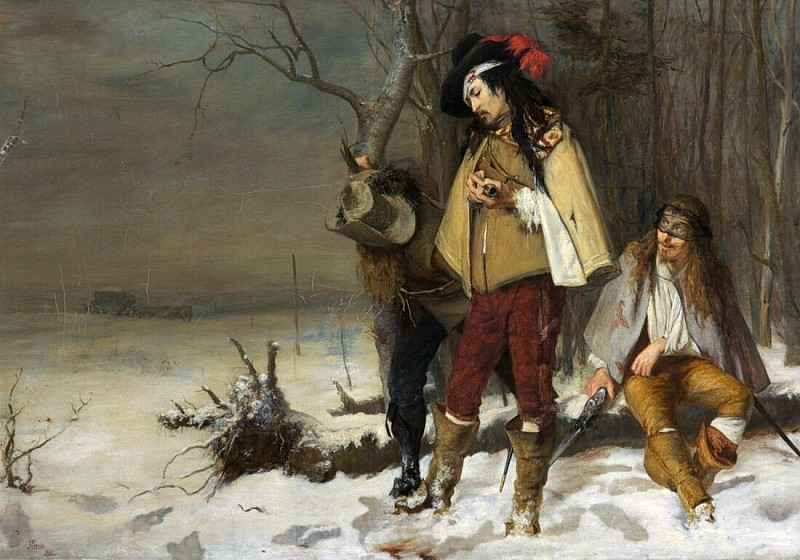 Композиция картины выстроена таким образом, что она направляет взгляд зрителя от фигуры молящегося к безжизненному телу воина. Этот визуальный акцент усиливает эмоциональное воздействие сцены и заставляет задуматься о цене власти, жертвах войны и неизбежности смерти.