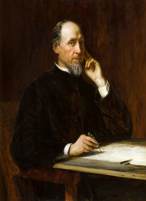 За спиной сидящего человека видна фигура в монашеском облачении, стоящая в тени. Его поза выражает смирение и покорность, он словно наблюдает за происходящим. На столе, помимо документов, находятся книги, перо и чернильница, что указывает на интеллектуальную деятельность и важность информации, с которой работает мужчина.