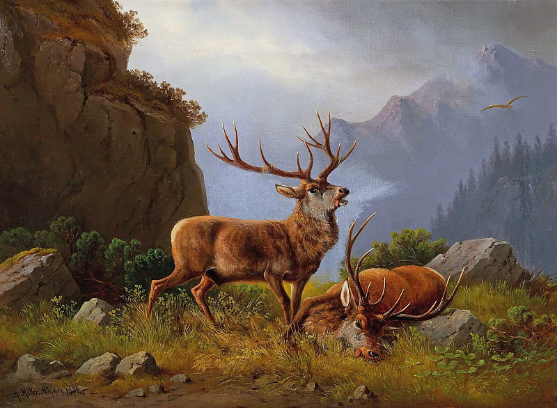 В картине можно увидеть подтекст борьбы за выживание в дикой природе. Столкновение двух оленей может быть интерпретировано как метафора жизненных испытаний и противостояния. Лежащий олень символизирует поражение, но также и стойкость перед лицом трудностей. Величественный горный пейзаж подчёркивает силу и величие природы, которая является одновременно источником жизни и опасности. Птица в небе может быть воспринята как символ свободы и надежды на лучшее будущее.