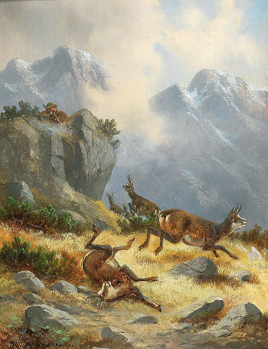 Сцена охоты, изображённая на картине, может быть интерпретирована как символ борьбы человека с природой. Охотник, занимающий доминирующее положение над животными, олицетворяет власть человека над окружающим миром. Однако, суровый горный пейзаж и драматизм момента намекают на то, что эта победа не является лёгкой и может иметь свою цену.