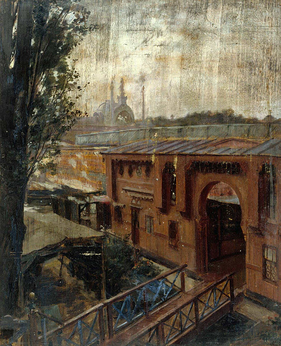 Цветовая палитра картины выдержана в приглушённых тонах: преобладают охристые, серые и коричневые оттенки. Это создаёт ощущение меланхолии и умиротворения. Манера письма характеризуется свободной, импрессионистической техникой, с использованием широких мазков и нечёткости контуров.