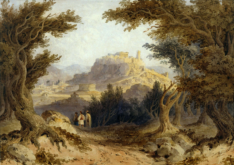 Фоном служит пейзаж с руинами древних построек, среди которых наиболее заметен Колизей – величественное сооружение, свидетельствующее о былой славе Римской империи. Небо над руинами окрашено в приглушённые тона зелёного и серого, что создаёт ощущение меланхолии и увядания.