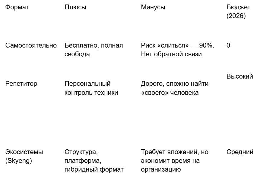 - Миф о среде. «Уеду в Лондон и заговорю». Не заговорите, если будете молчать. Искусственная языковая среда дома (интерфейс телефона, подкасты в машине) часто эффективнее пассивного проживания за границей.