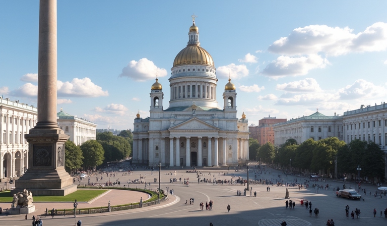 Градостроительная тема была широко представлена в России. По замыслу Карла Росси (1775-1849) создаётся «правильная площадь» перед Зимним дворцом, характеризуемая неразрывной связью зданий с планировкой самого участка площади. Фасады построек были не только внешним оформлением сооружения, но и границей пространства площади, определяя формы и размеры проездов. Им возводятся ансамбли Михайловского дворца, Александрийского театра, зданий Сената и Синода в Санкт-Петербурге. Московский ампир отличался большей мягкостью форм, национальными чертами.