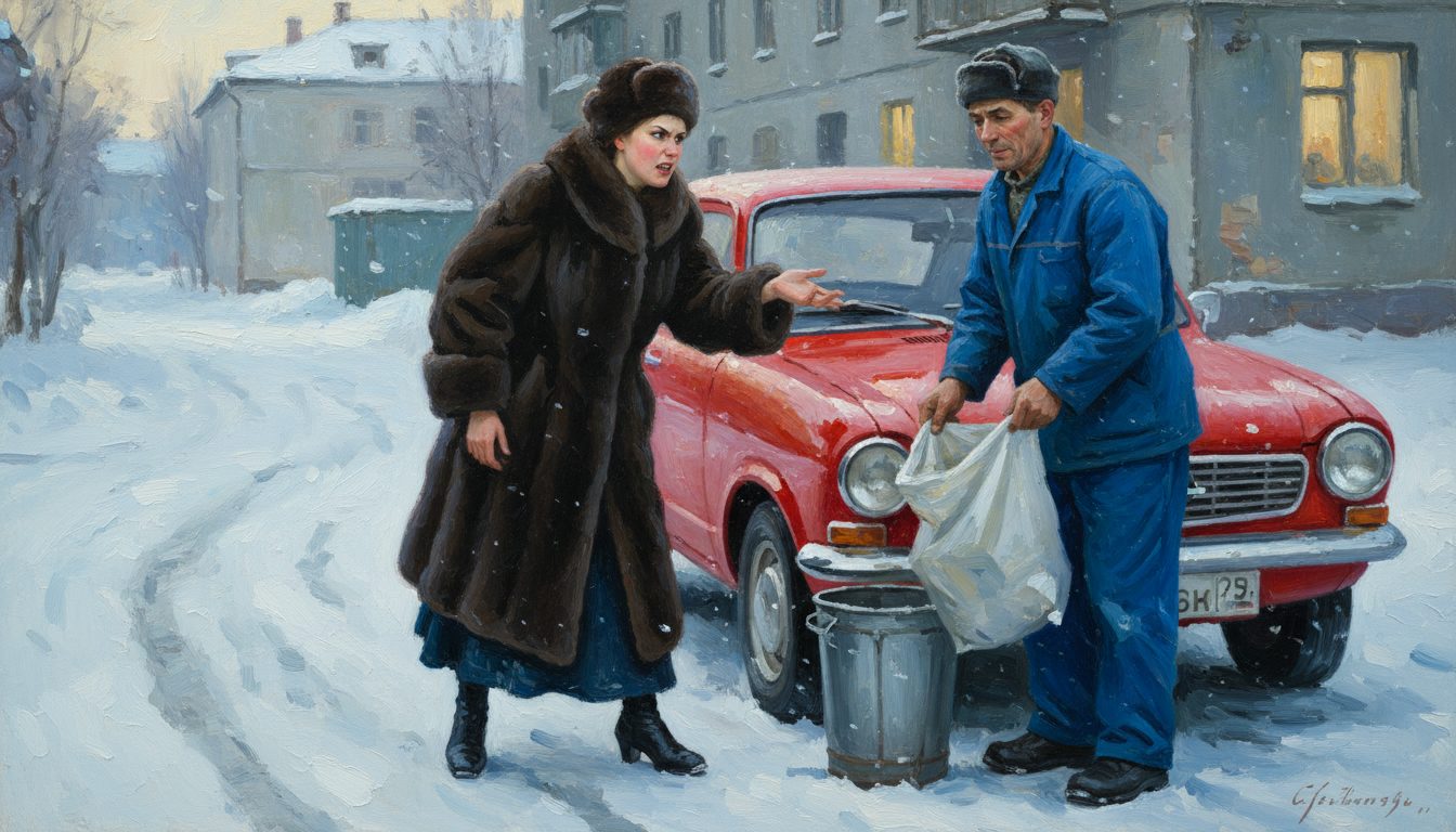 Мусорщик приходит в безупречном модельном костюме, напоминая дипломата или гангстера времён Сухого закона. Они начинают психологическую игру. Каждый по очереди рассказывает биографию собеседника, основываясь на личных наблюдениях. Мусорщик точно описывает циничный путь девушки из родного города в столицу, её обучение в театральном училище и стремление к победе любой ценой. Девушка угадывает его одинокое детство, увлечение книгами и службу в десантных войсках. Вечер заканчивается без интимной близости. Мусорщик уходит, оставив девушку в ярости разбивать хрустальный бокал о стену.