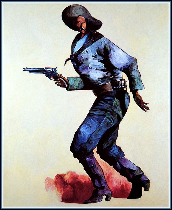 Возможно, это картина, изображающая человека в ковбойской шляпе, едущего на гепарде посреди пустыни с горами на заднем плане.