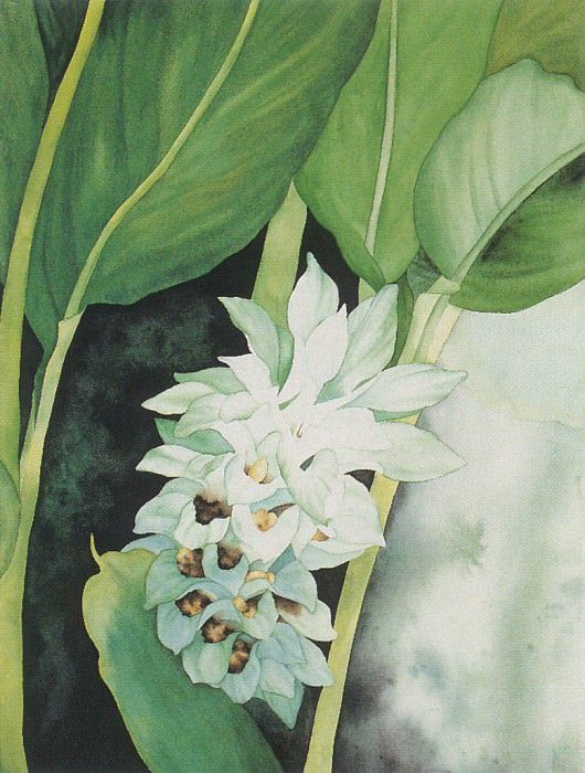 Возможно, это картина с изображением букета цветов, сидящего на вершине зеленого листового растения с красными и белыми цветами в центре.