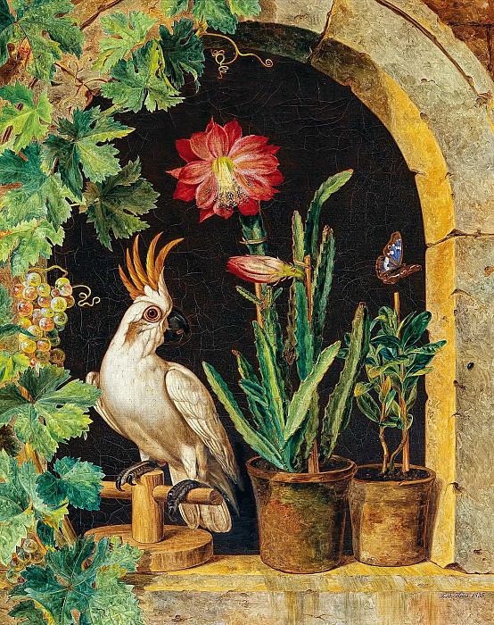 В нижней части картины автор разместил несколько дополнительных элементов: голубя, сидящего на деревянной поверхности, опавшие цветы и персик. Голубь, традиционный символ мира и невинности, привносит в композицию элемент лиризма и задумчивости. Его поза, слегка наклонённая голова, создают впечатление спокойствия и созерцательности. Опавшие цветы, лежащие у подножия вазы, намекают на бренность красоты и неизбежность увядания. Персик, расположенный рядом с цветами, добавляет ощущение изобилия и чувственности.
