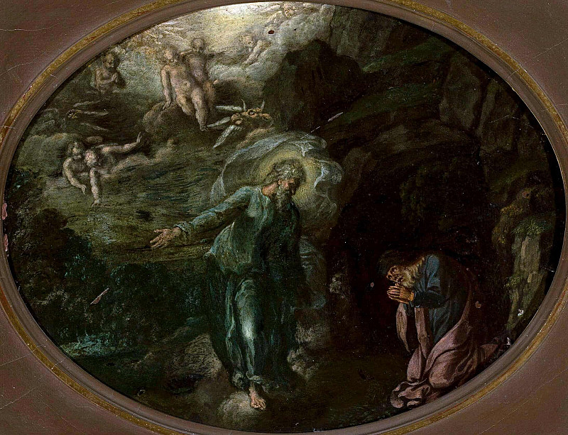 На картине представлен драматичный эпизод, разворачивающийся в живописном пейзаже. В центре композиции – обнажённая женщина, чья поза выражает крайнее удивление и отвращение. Она прикрывает лицо руками, словно пытаясь защититься от увиденного. Ее тело, освещённое ярким светом, контрастирует с тёмными тенями, окружающими ее.