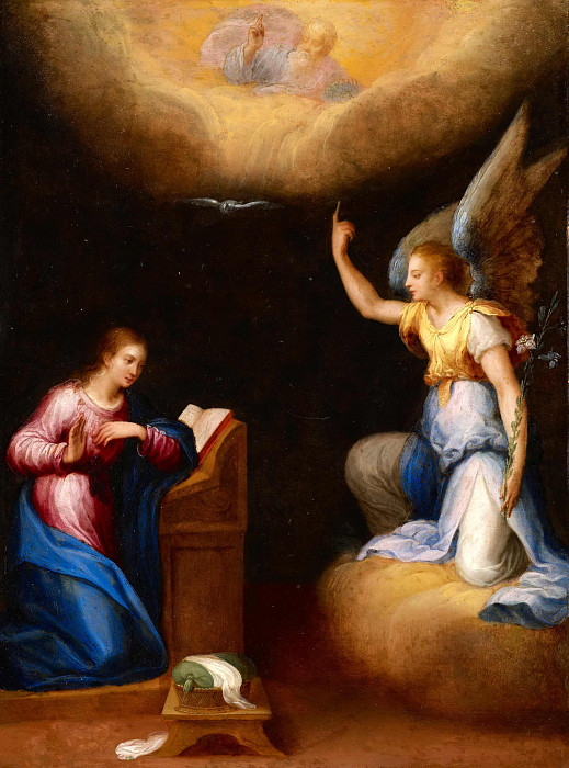 В верхней части картины расположена группа ангелов, парящих в облаках. Они держат венок, который, вероятно, предназначен для возложения на голову ребёнка. Облачный пейзаж создаёт ощущение небесной сферы и подчёркивает божественную природу происходящего.