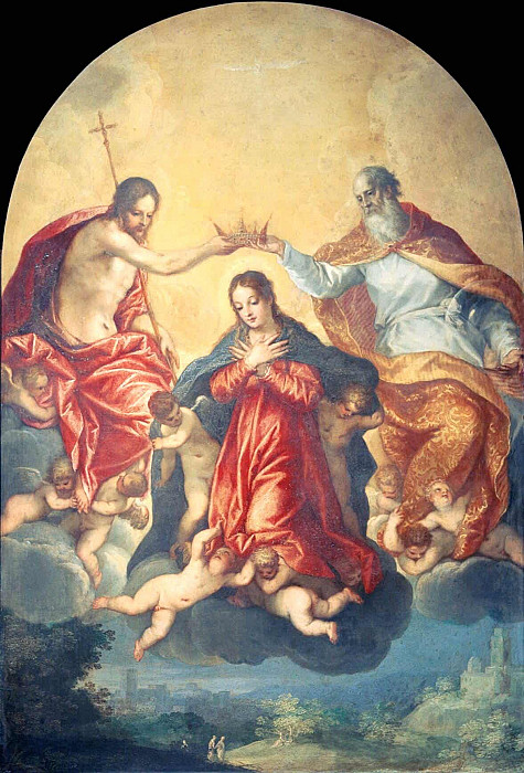 Над центральной группой персонажей парят два ангела, один из которых держит ткань, создающую впечатление небесного свода. Внизу картины изображён ещё один ангел, играющий на музыкальном инструменте, что добавляет сцене лиричности и умиротворения.