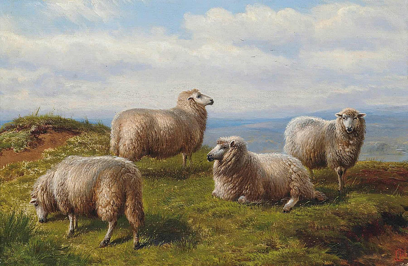 На картине представлен пейзаж с изображением стада овец, пасущихся на вершине мыса. В центре композиции – группа животных различной окраски: от почти чёрных до светло-серых. Они расположены на зелёном холме, покрытом травой, создавая ощущение простора и естественности.