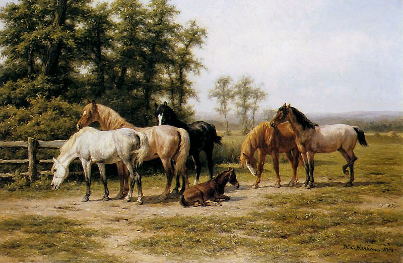 Возможно, это изображение группы лошадей, стоящих перед сараем, с мужчиной, стоящим рядом с лошадью, и женщиной, сидящей на краю сарая.