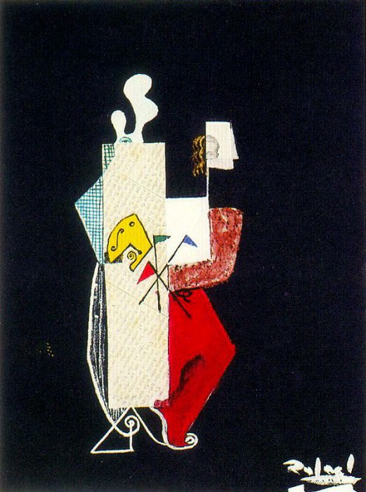 Возможно, это картина на красно-жёлтом фоне с хвостом животного, торчащим из верхней части головы животного, и головой другого животного, торчащей из его тела.