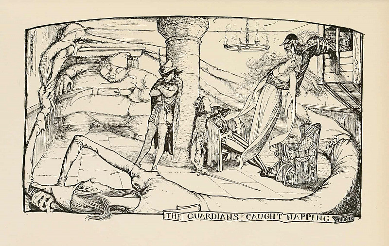 Фон картины представляет собой пейзаж с водоёмом и деревьями, выполненный в упрощённой манере. На заднем плане видны очертания замка или другого архитектурного сооружения, что добавляет сцене элемент таинственности и сказочности.