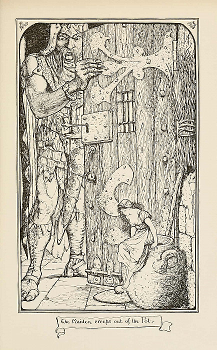 Верхняя часть изображения заполнена детальной прорисовкой архитектурных элементов и растительного орнамента, что придаёт сцене декоративность и подчёркивает ее сказочный характер.
