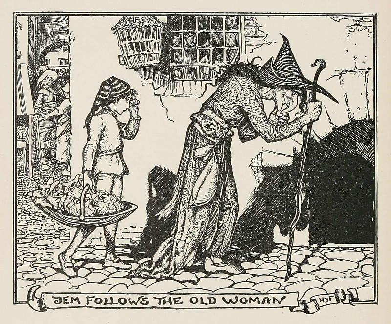 Справа от центральной группы изображена женщина в пышном платье, стоящая у окна дома. За ней видны ещё несколько детей, выглядывающих из оконных проёмов. Их позы и выражения лиц передают любопытство и некоторую дистанцированность от происходящего.