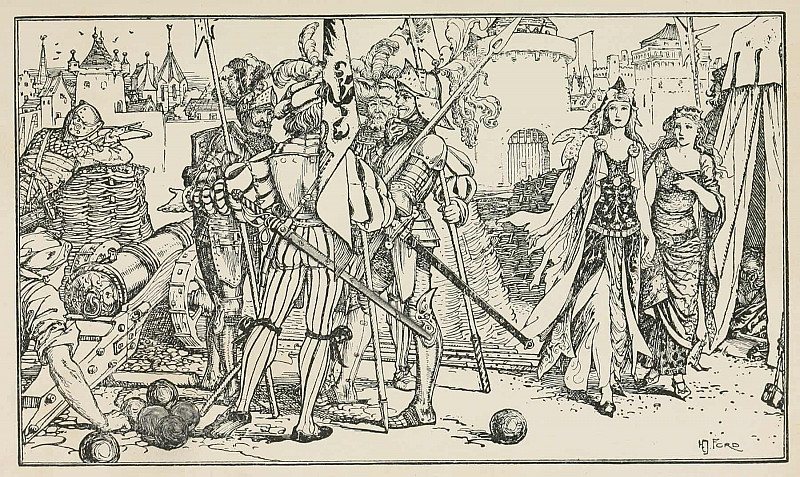 В нижней части гравюры изображён скалистый выступ, служащий фоном для сцены. Его неровная поверхность и резкие очертания контрастируют с плавными линиями фигур фей и младенца, подчёркивая их отстранённость от земного мира.
