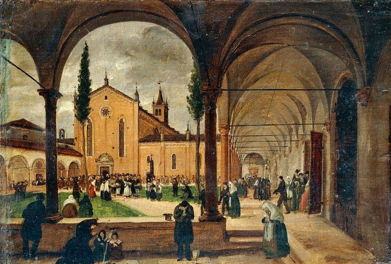 Небо над городом заполнено облаками, создающими драматический эффект и смягчающими освещение. Цветовая гамма картины приглушённая, преобладают оттенки серого, коричневого и бежевого, что создаёт атмосферу меланхолии и созерцательности.