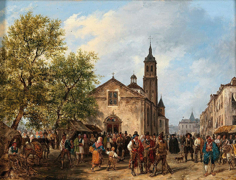 На переднем плане мы видим небольшую группу людей: трое всадников и сопровождающий их пёс. Их фигуры кажутся маленькими и незначительными по сравнению с величием природы, что создаёт ощущение человека как части огромного мира. Неподалёку стоит крест, одиноко возвышающийся над землёй, возможно, символизирующий религиозные мотивы или напоминание о бренности бытия.