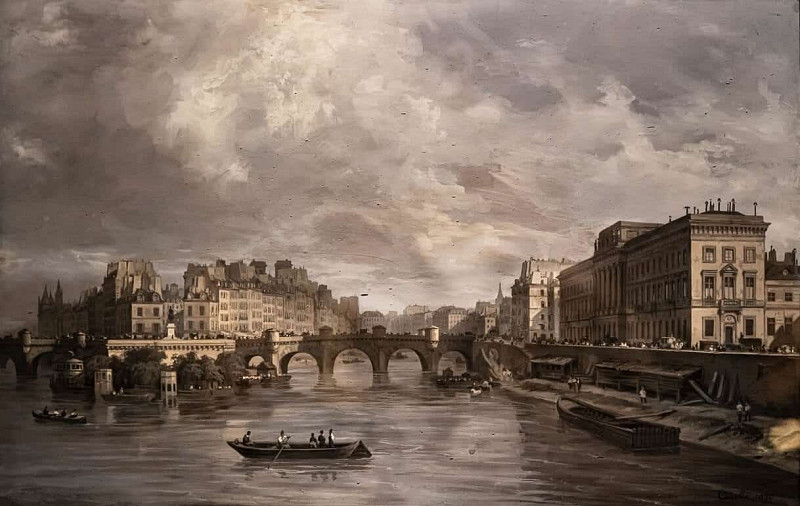 На представленной картине автор запечатлел городской пейзаж, вероятно, в Венеции. В центре композиции доминирует массивное здание с характерной архитектурой: фасадом, украшенным аркадами и декоративными элементами, что указывает на его значимость и историческую ценность. Здание занимает большую часть левой части полотна, создавая ощущение монументальности и величия.
