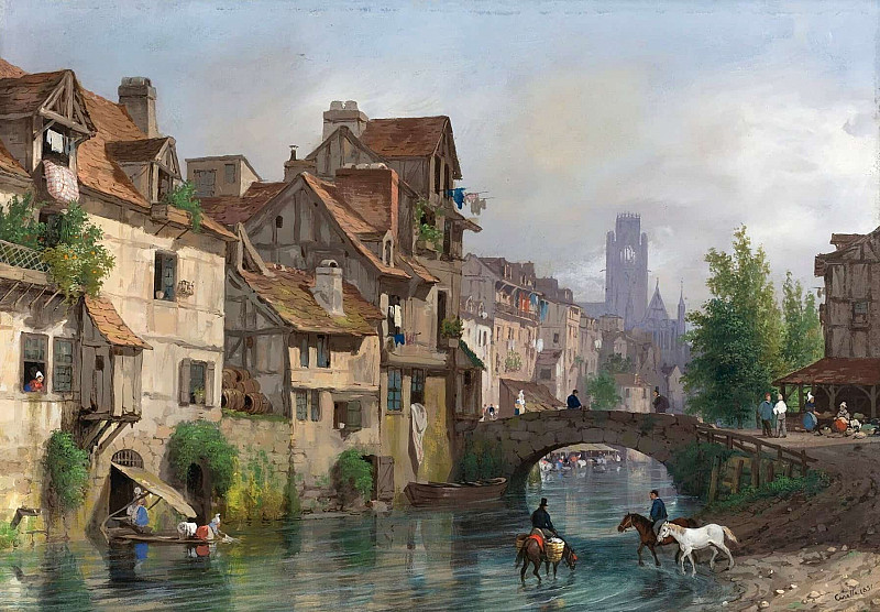 Вдалеке видны корабли, что указывает на торговое значение этого места. Они добавляют картине ощущение глубины и перспективы.