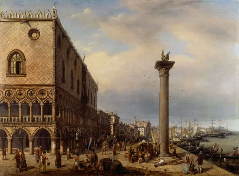На водной глади канала скользят несколько лодок, занятые своими делами люди добавляют сцене динамизма и жизни. Вдали, на линии горизонта, виднеются более удалённые постройки, растворяющиеся в дымке атмосферы.