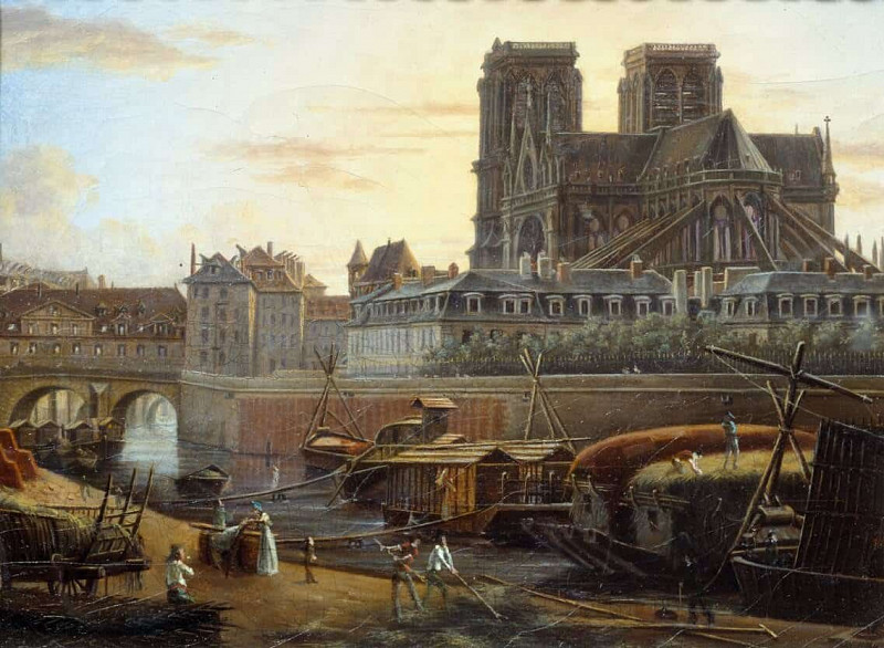 Архитектурный фон картины представляет собой многоэтажные здания с балконами и окнами, из которых пробивается слабый свет. Они создают ощущение плотности городской застройки и подчёркивают масштаб происходящего. Деревья, расположенные вдоль улицы, добавляют картине живости и естественности, смягчая строгость архитектурных форм.