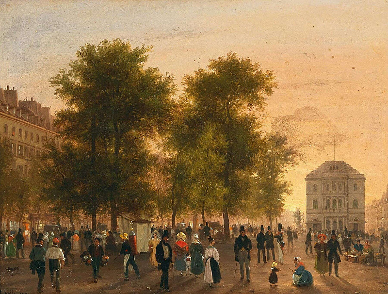 Перед зданием мы видим группу людей, сопровождающих ослика, нагруженного чем-то большим. Их присутствие придаёт сцене ощущение повседневной жизни и контрастирует с величием архитектуры. Фигуры изображены в традиционной одежде, что указывает на определённый исторический период или географическую локацию.