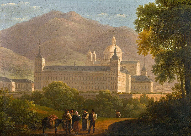В переднем плане изображены несколько фигур людей, одетых в простую одежду, вероятно, местные жители или крестьяне. Они кажутся погруженными в повседневные дела, не обращая внимания на величественный архитектурный ансамбль. Небольшая группа детей играет неподалёку от здания.