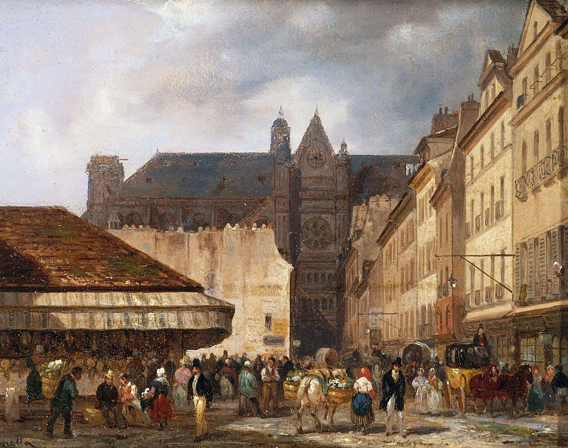 На улице кипит жизнь: мы видим множество людей – пешеходов, экипажи с каретами, конные повозки. Одежда персонажей указывает на определённый социальный статус и моду того времени. Фигуры изображены в движении, что создаёт ощущение динамизма и реалистичности сцены.